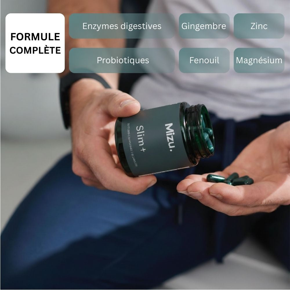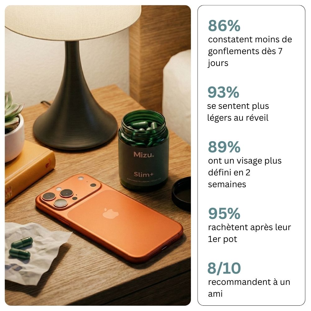 Mizu Slim+ ne fait pas “maigrir” comme un brûleur de graisse, mais il élimine le gonflement dû à la rétention d’eau et améliore la digestion.